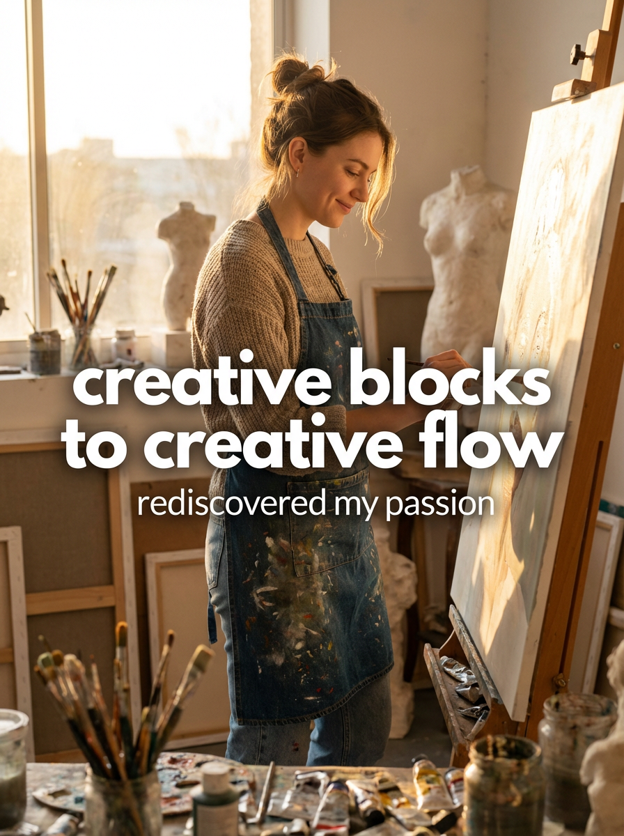 model in creative workspace outfit in art studio or creative space, working on project, inspiring lighting, creative chaos. TikTok text overlay: "creative blocks to creative flow" smaller text: "(rediscovered my passion)" , do not show tiktok interface