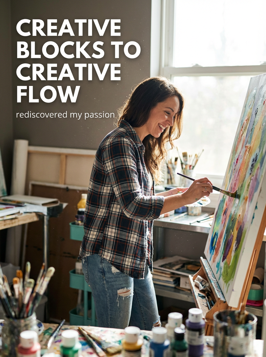 model in creative workspace outfit in art studio or creative space, working on project, inspiring lighting, creative chaos. TikTok text overlay: "creative blocks to creative flow" smaller text: "(rediscovered my passion)" , do not show tiktok interface