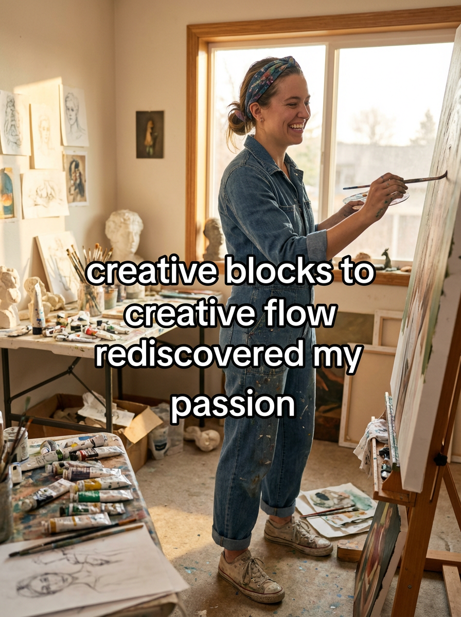 model in creative workspace outfit in art studio or creative space, working on project, inspiring lighting, creative chaos. TikTok TikTok-style text overlay with white text with black outline: "creative blocks to creative flow" smaller text: "(rediscovered my passion)" , do not show tiktok interface or logo
