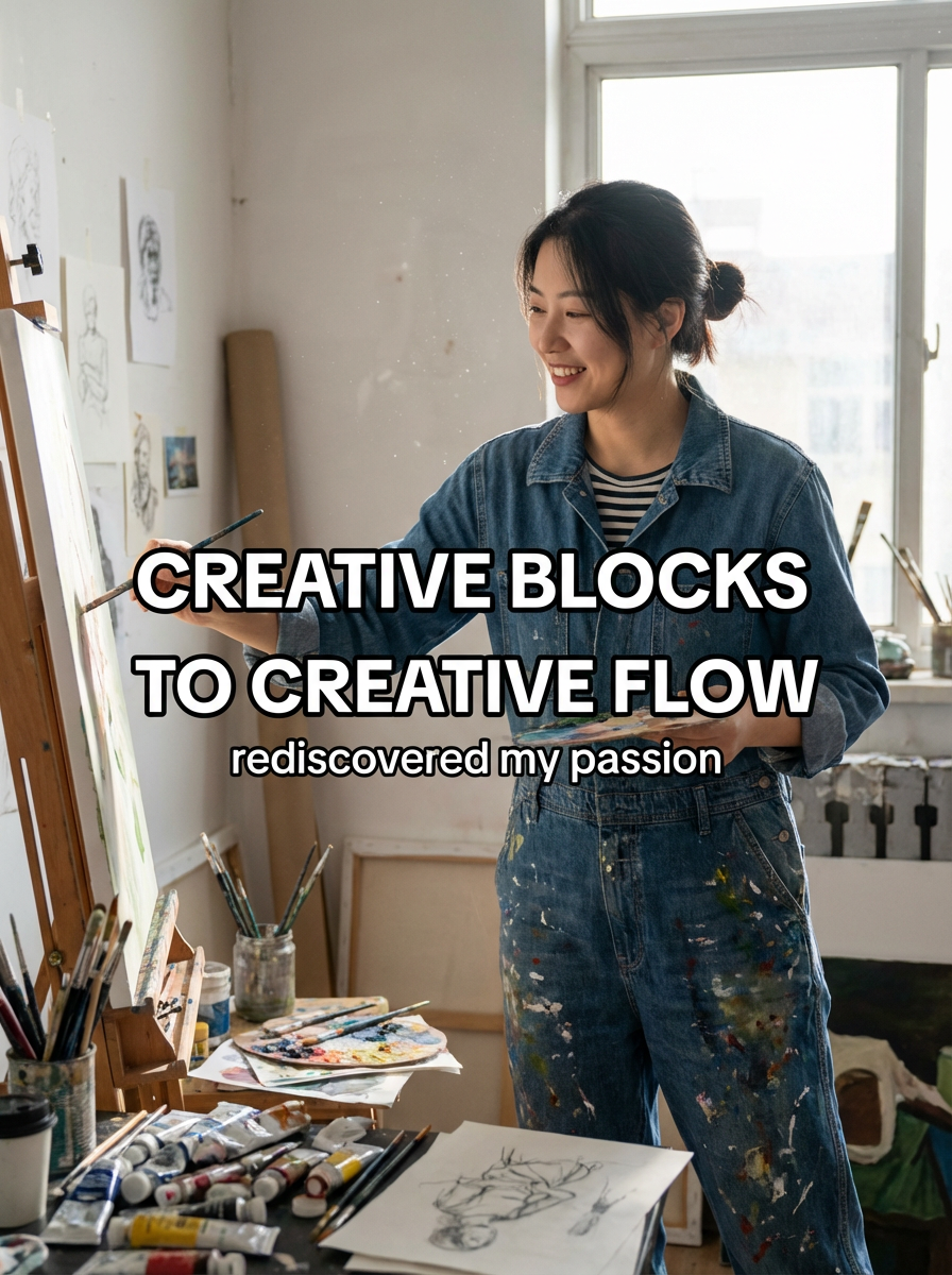 model in creative workspace outfit in art studio or creative space, working on project, inspiring lighting, creative chaos. TikTok TikTok-style text overlay with white text with black outline: "creative blocks to creative flow" smaller text: "(rediscovered my passion)" , do not show tiktok interface or logo