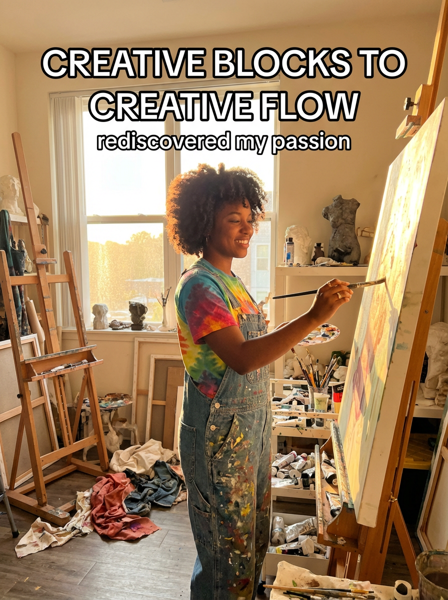 model in creative workspace outfit in art studio or creative space, working on project, inspiring lighting, creative chaos. TikTok TikTok-style text overlay with white text with black outline: "creative blocks to creative flow" smaller text: "(rediscovered my passion)" , do not show tiktok interface or logo