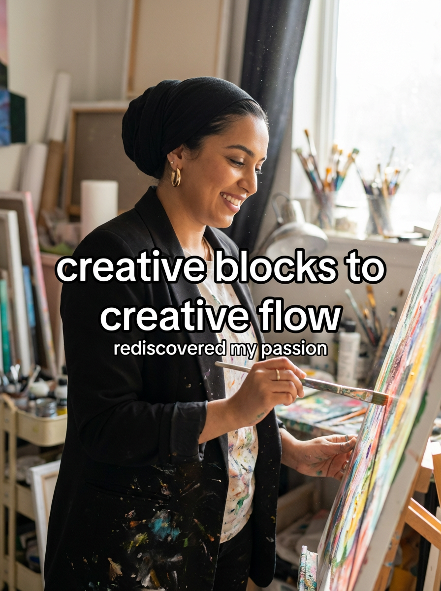 model in creative workspace outfit in art studio or creative space, working on project, inspiring lighting, creative chaos. TikTok-style text overlay with white text with black outline: "creative blocks to creative flow" smaller text: "(rediscovered my passion)" , do not show tiktok interface or logo