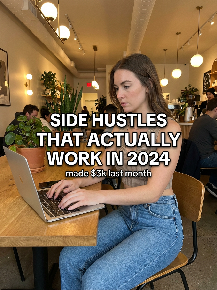 model in crop top and high-waisted jeans in trendy coffee shop, laptop open, focused expression, warm cafe lighting, plants and modern decor. TikTok text overlay: "side hustles that actually work in 2024" smaller text: "(made $3k last month)" , do not show tiktok interface