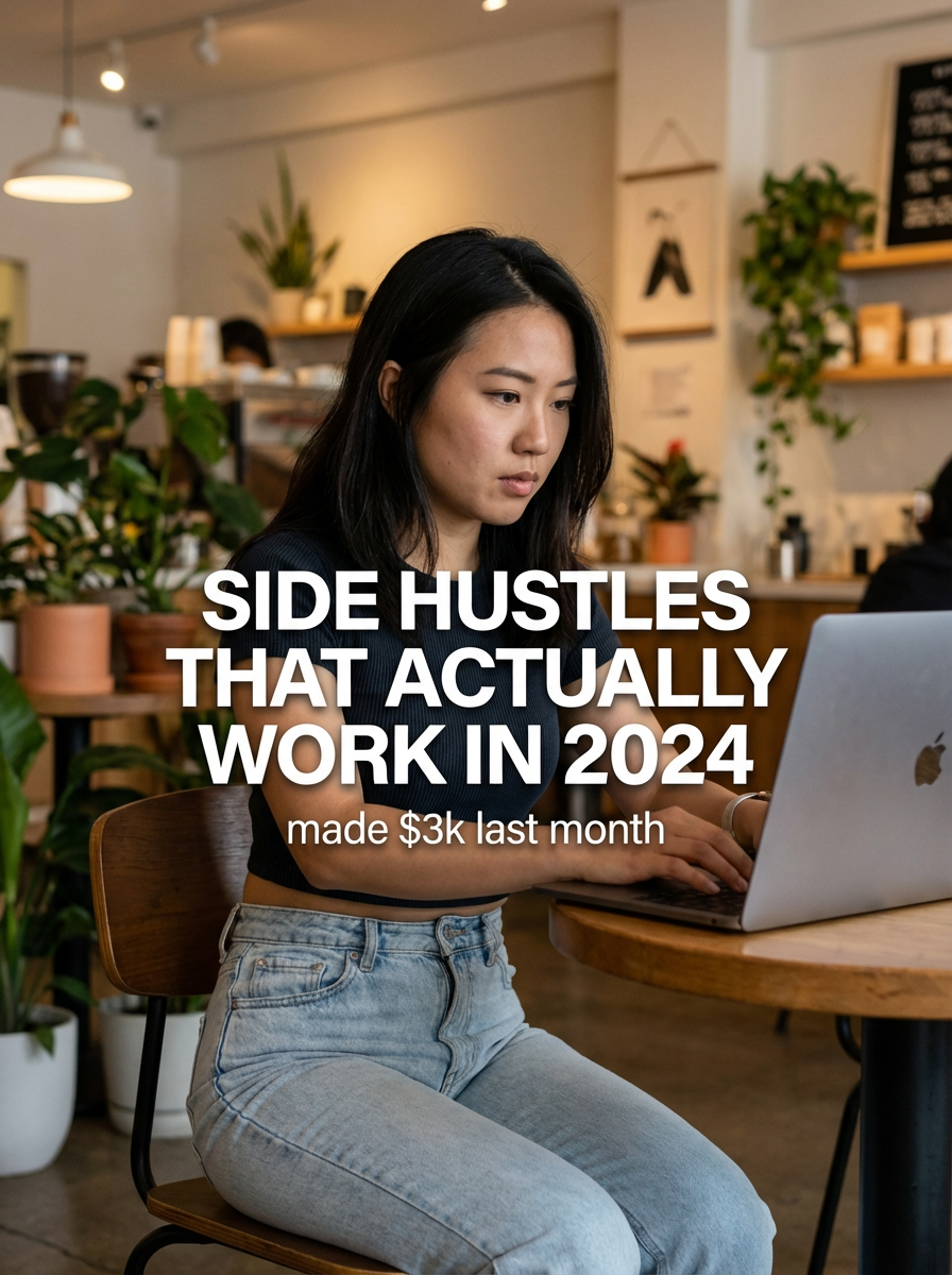 model in crop top and high-waisted jeans in trendy coffee shop, laptop open, focused expression, warm cafe lighting, plants and modern decor. TikTok text overlay: "side hustles that actually work in 2024" smaller text: "(made $3k last month)" , do not show tiktok interface