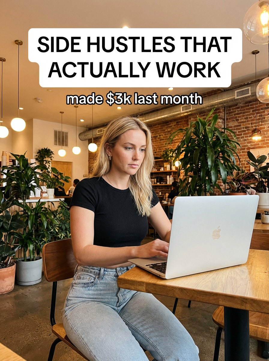 model in crop top and high-waisted jeans in trendy coffee shop, laptop open, focused expression, warm cafe lighting, plants and modern decor. TikTok-style text overlay with white text with black outline: "side hustles that actually work" smaller text: "(made $3k last month)" , do not show tiktok interface or logo