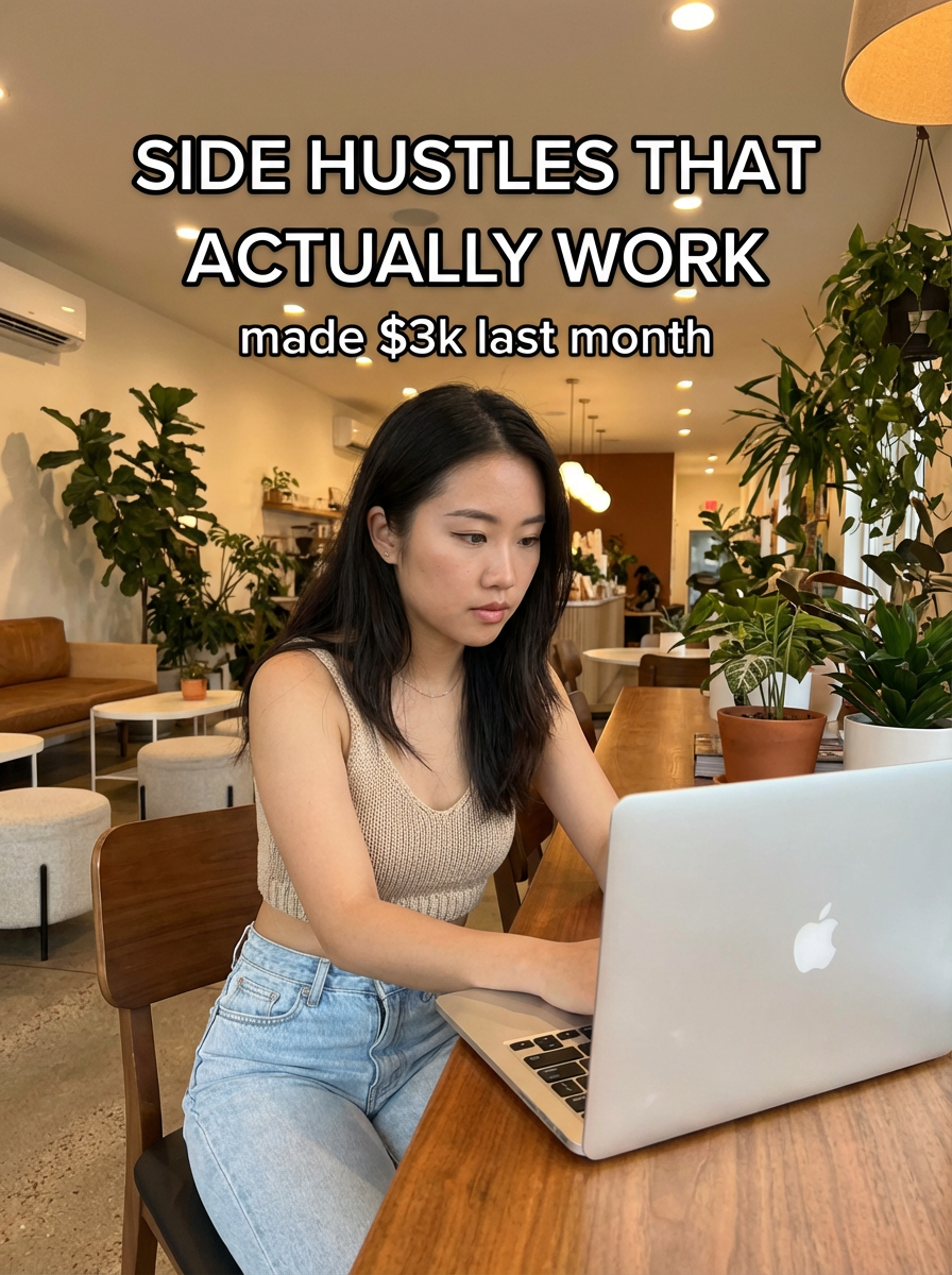 model in crop top and high-waisted jeans in trendy coffee shop, laptop open, focused expression, warm cafe lighting, plants and modern decor. TikTok-style text overlay with white text with black outline: "side hustles that actually work" smaller text: "(made $3k last month)" , do not show tiktok interface or logo