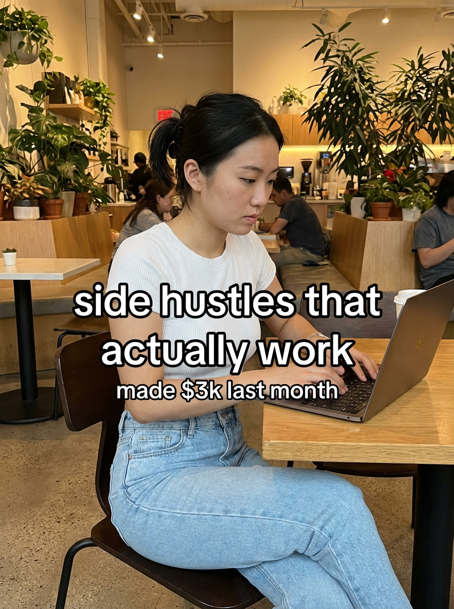 model in crop top and high-waisted jeans in trendy coffee shop, laptop open, focused expression, warm cafe lighting, plants and modern decor. TikTok-style text overlay with white text with black outline: "side hustles that actually work" smaller text: "(made $3k last month)" , do not show tiktok interface or logo