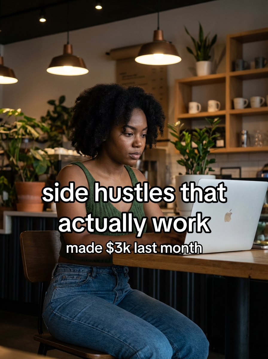 model in crop top and high-waisted jeans in trendy coffee shop, laptop open, focused expression, warm cafe lighting, plants and modern decor. TikTok-style text overlay with white text with black outline: "side hustles that actually work" smaller text: "(made $3k last month)" , do not show tiktok interface or logo