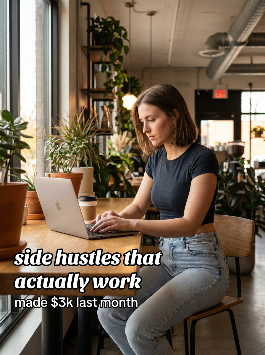 model in crop top and high-waisted jeans in trendy coffee shop, laptop open, focused expression, warm cafe lighting, plants and modern decor. TikTok-style text overlay with white text with black outline: "side hustles that actually work" smaller text: "(made $3k last month)" , do not show tiktok interface or logo