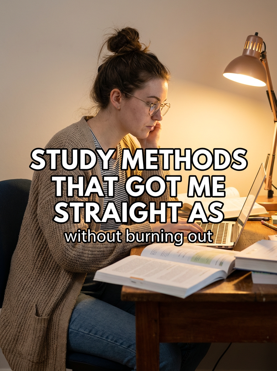 model in cute study outfit at desk with textbooks and laptop, focused expression, desk lamp lighting. TikTok TikTok-style text overlay with white text with black outline: "study methods that got me straight As" smaller text: "(without burning out)" , do not show tiktok interface or logo
