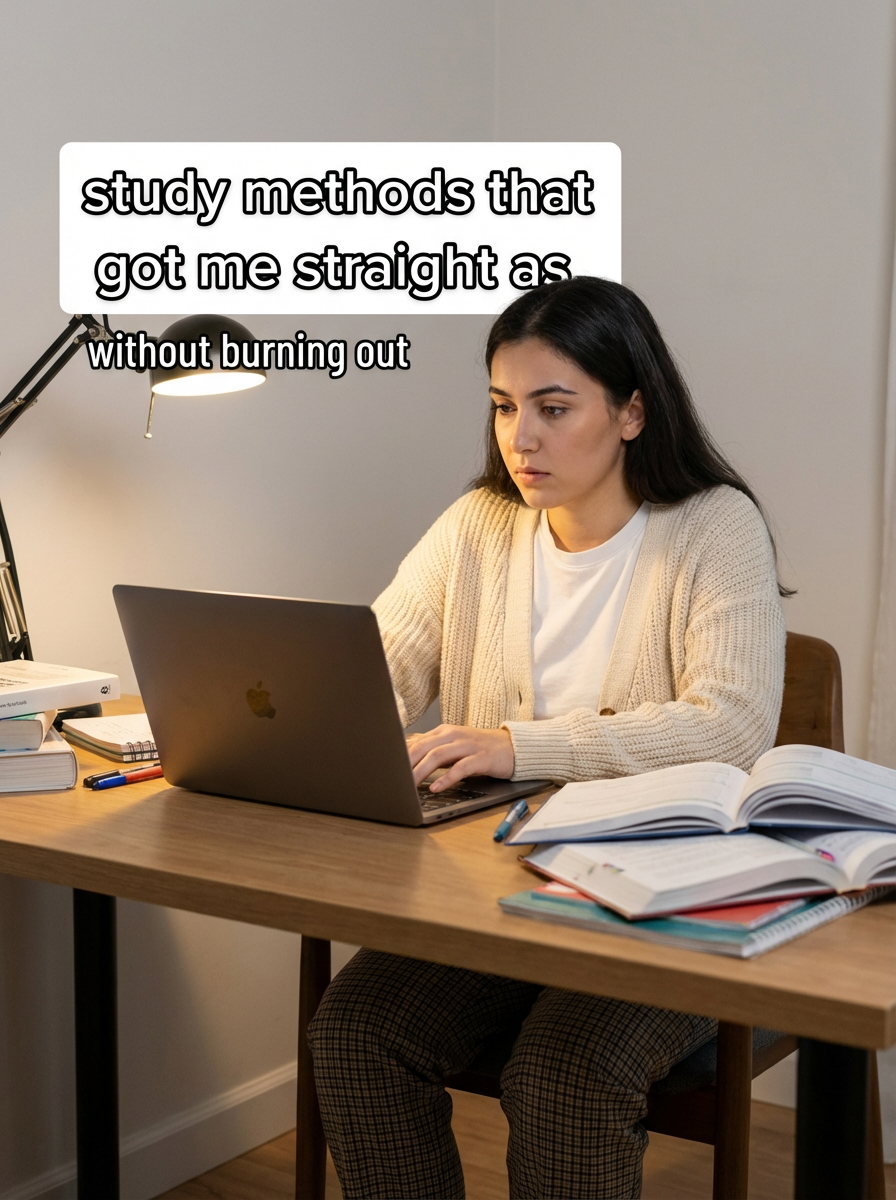 model in cute study outfit at desk with textbooks and laptop, focused expression, desk lamp lighting. TikTok TikTok-style text overlay with white text with black outline: "study methods that got me straight As" smaller text: "(without burning out)" , do not show tiktok interface or logo