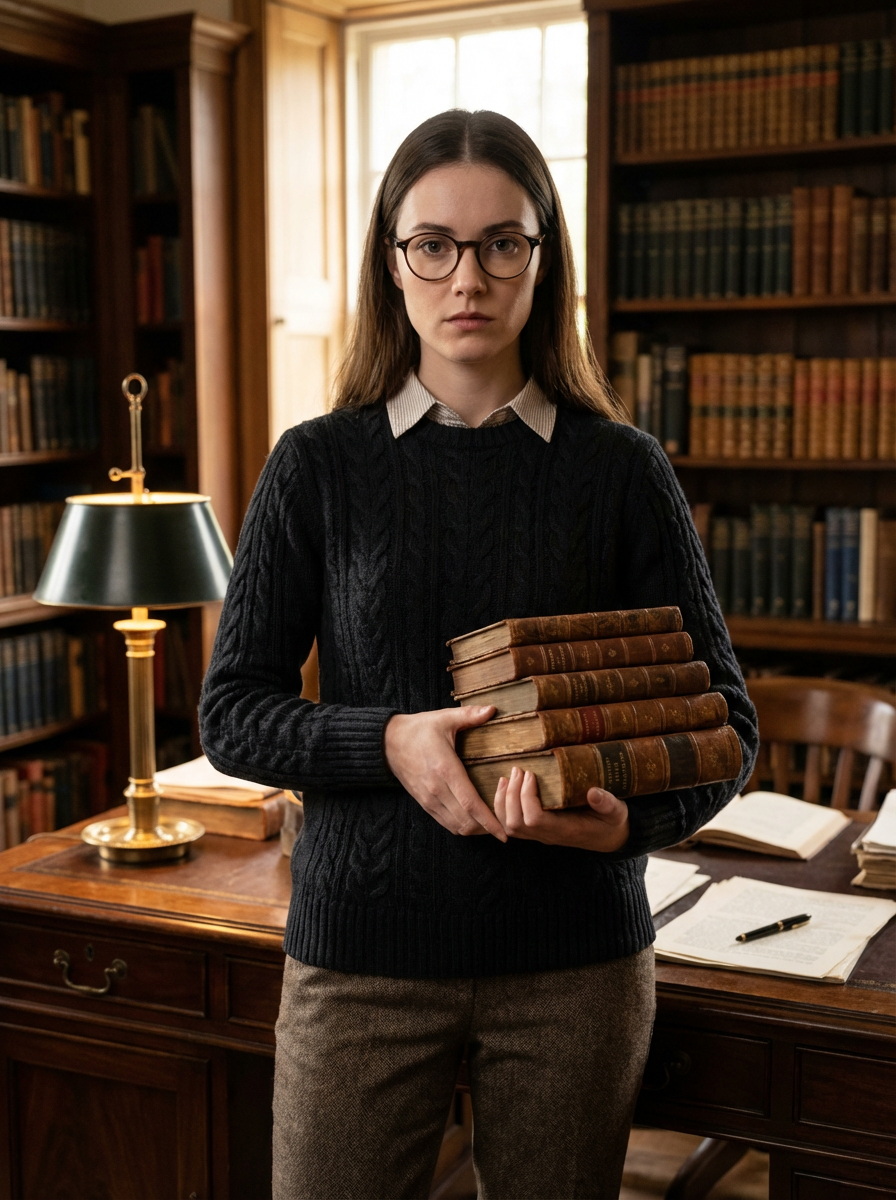 model in dark academia aesthetic, round glasses, cable knit sweater, stack of antique books, study desk scene