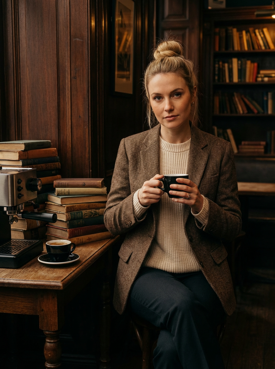 model in dark academia coffee shop, espresso and books, tweed and knits, warm moody interior