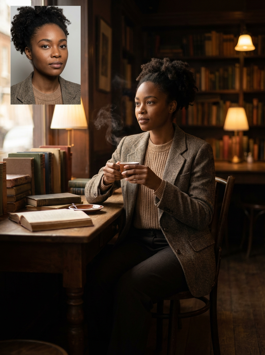 model in dark academia coffee shop, espresso and books, tweed and knits, warm moody interior