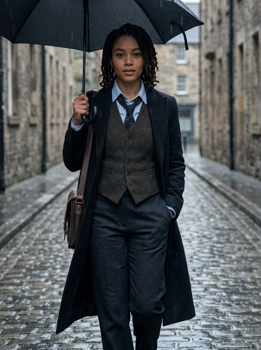 model in dark academia layers, vest over button-up, loose tie, carrying leather satchel, rainy day aesthetic