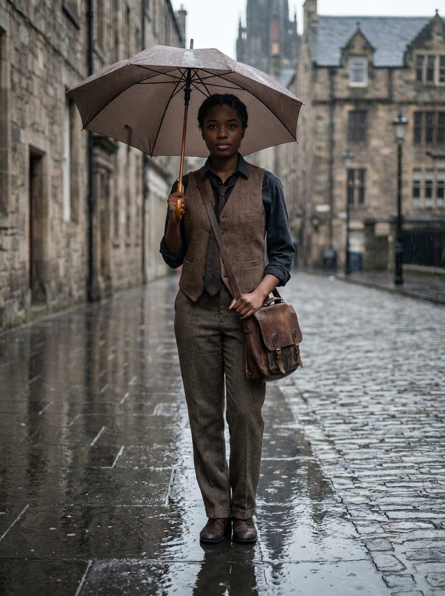 model in dark academia layers, vest over button-up, loose tie, carrying leather satchel, rainy day aesthetic