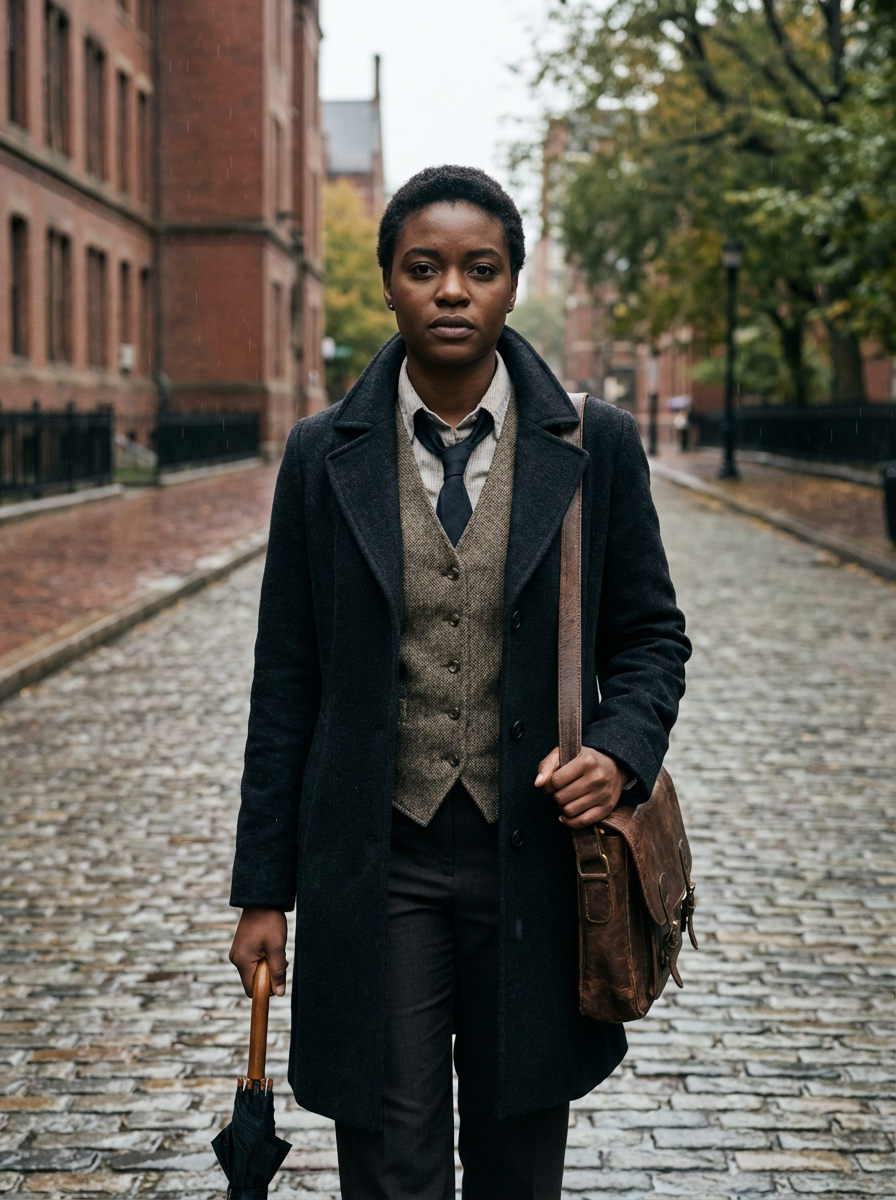 model in dark academia layers, vest over button-up, loose tie, carrying leather satchel, rainy day aesthetic