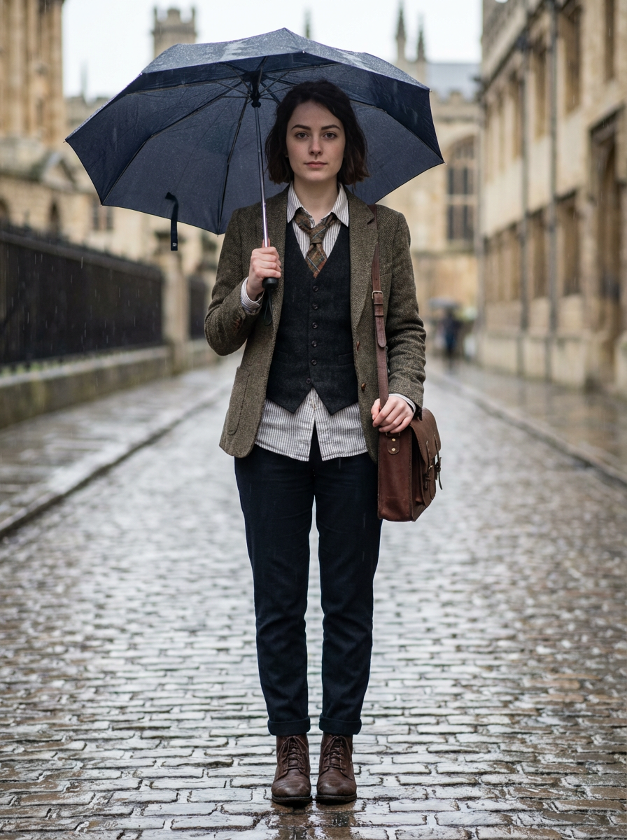model in dark academia layers, vest over button-up, loose tie, carrying leather satchel, rainy day aesthetic