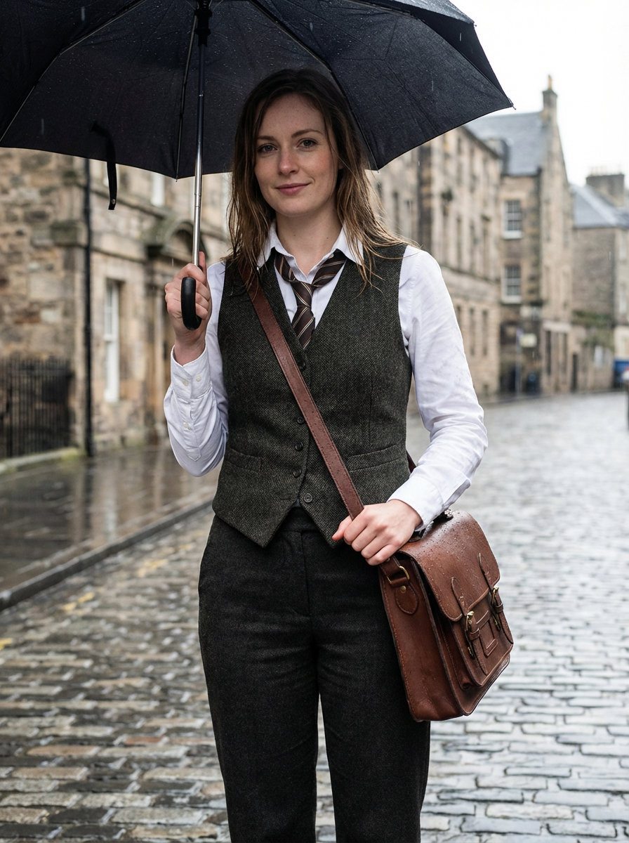 model in dark academia layers, vest over button-up, loose tie, carrying leather satchel, rainy day aesthetic