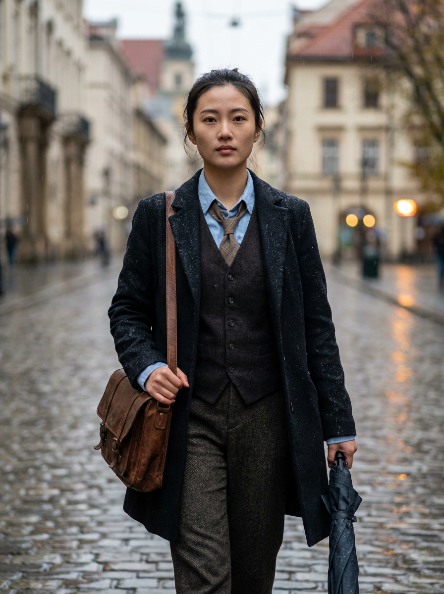 model in dark academia layers, vest over button-up, loose tie, carrying leather satchel, rainy day aesthetic