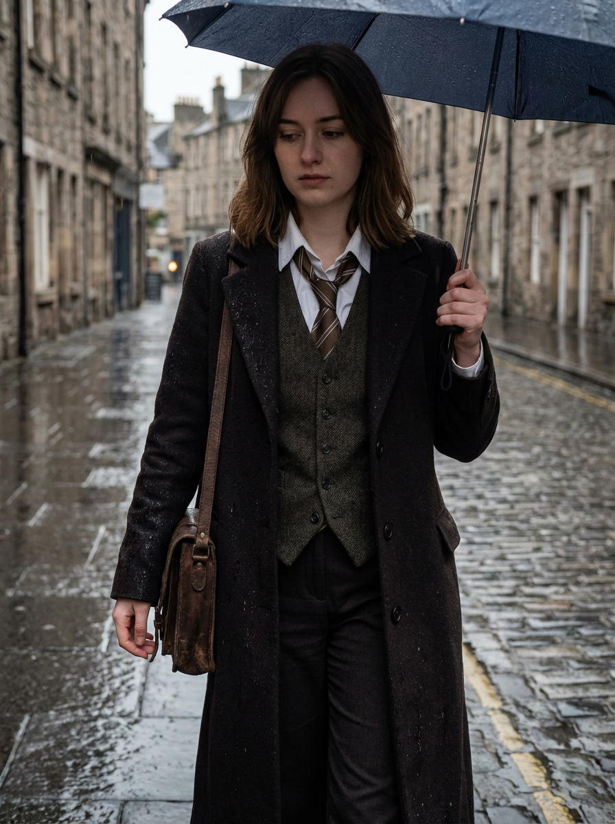 model in dark academia layers, vest over button-up, loose tie, carrying leather satchel, rainy day aesthetic