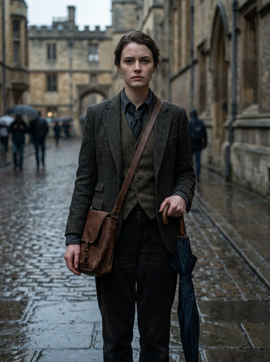 model in dark academia layers, vest over button-up, loose tie, carrying leather satchel, rainy day aesthetic
