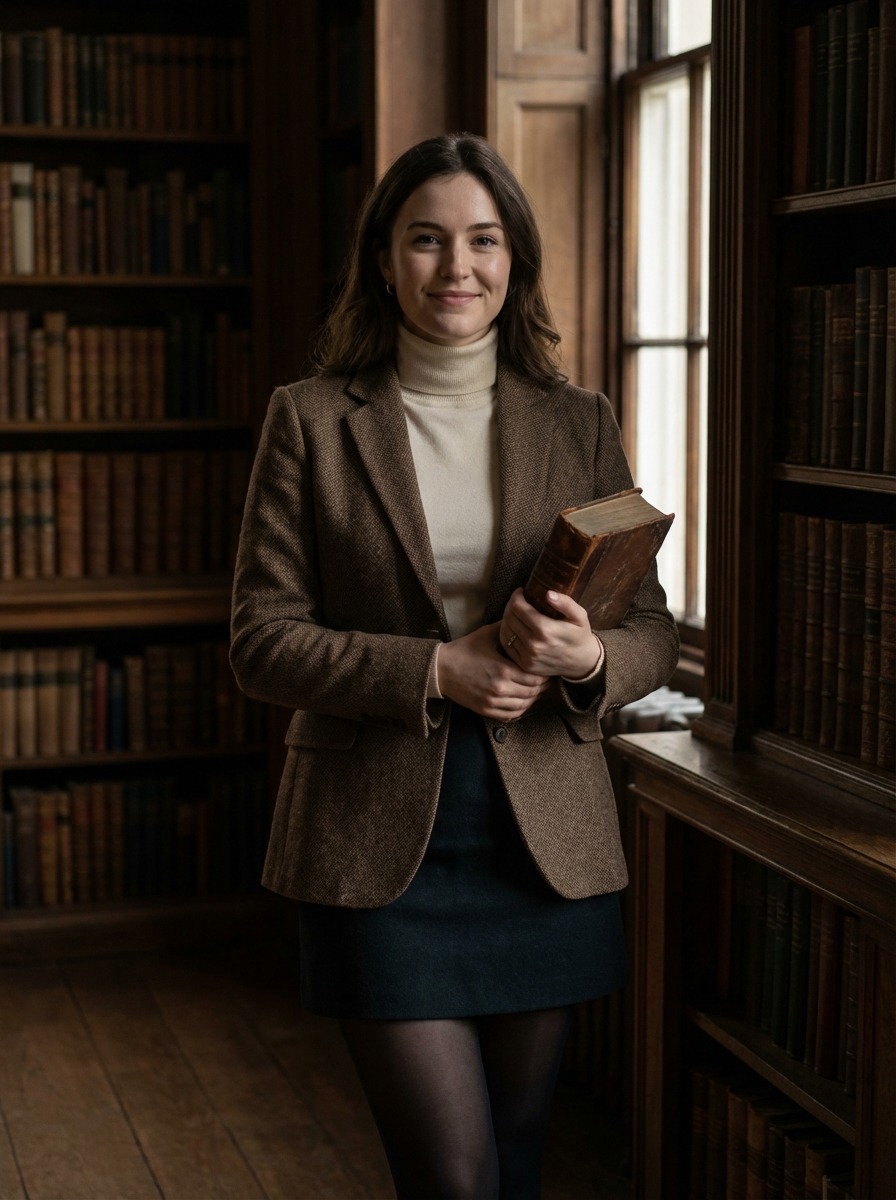 model in dark academia outfit, brown tweed blazer, cream turtleneck, vintage library background, moody lighting, holding old book
