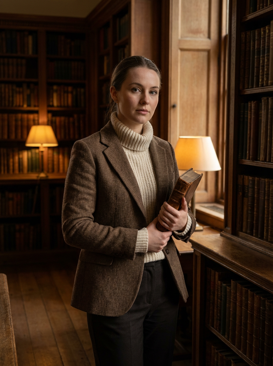 model in dark academia outfit, brown tweed blazer, cream turtleneck, vintage library background, moody lighting, holding old book