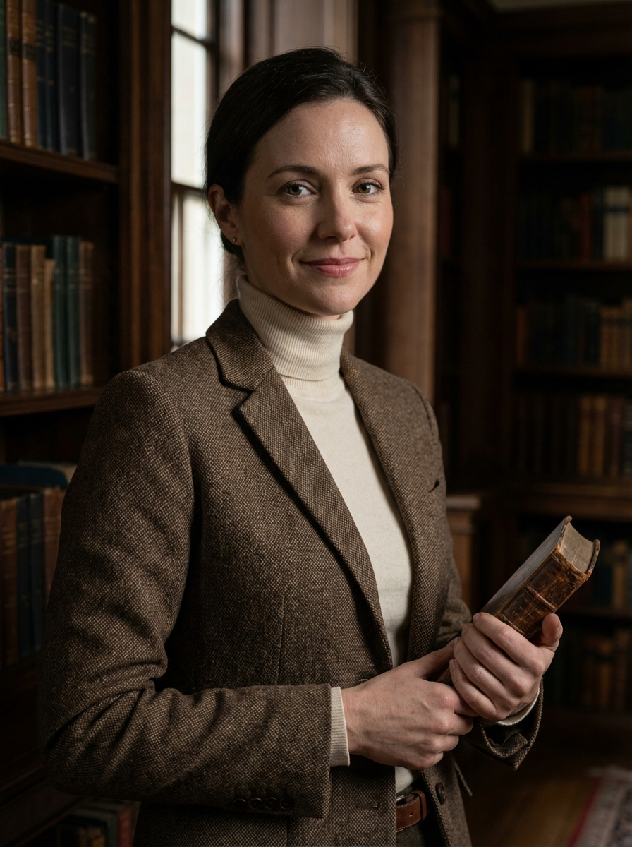 model in dark academia outfit, brown tweed blazer, cream turtleneck, vintage library background, moody lighting, holding old book