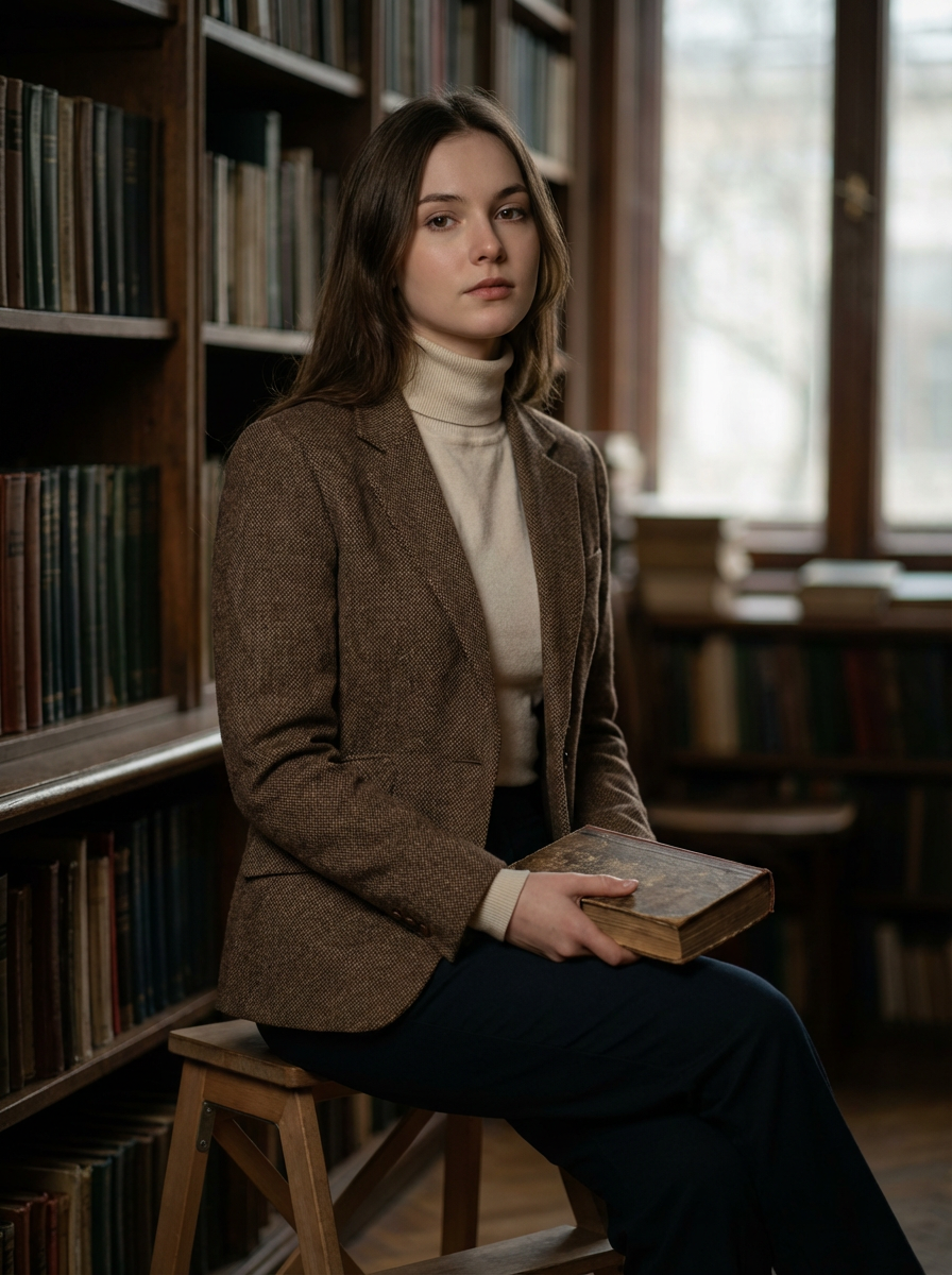 model in dark academia outfit, brown tweed blazer, cream turtleneck, vintage library background, moody lighting, holding old book