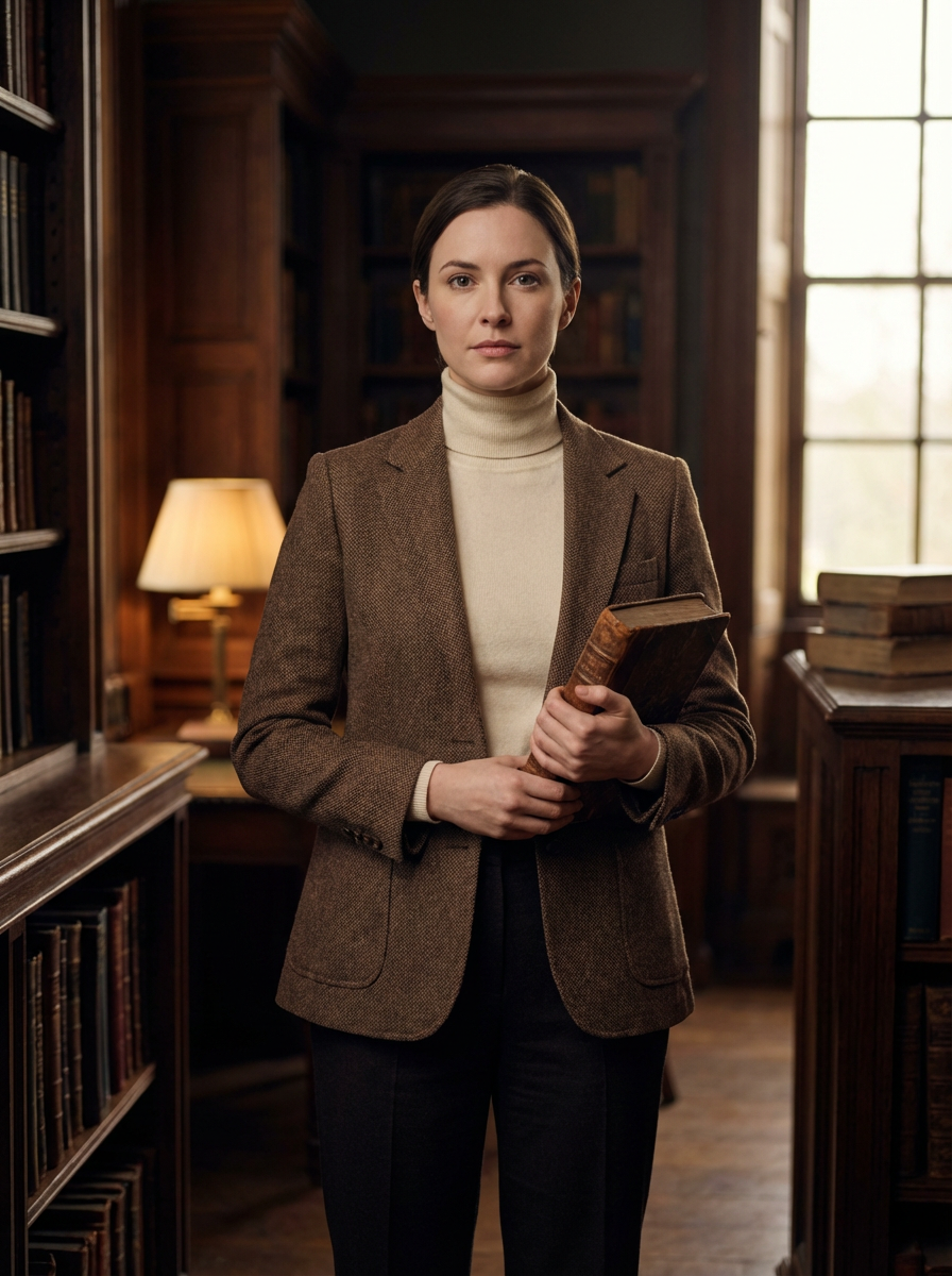 model in dark academia outfit, brown tweed blazer, cream turtleneck, vintage library background, moody lighting, holding old book