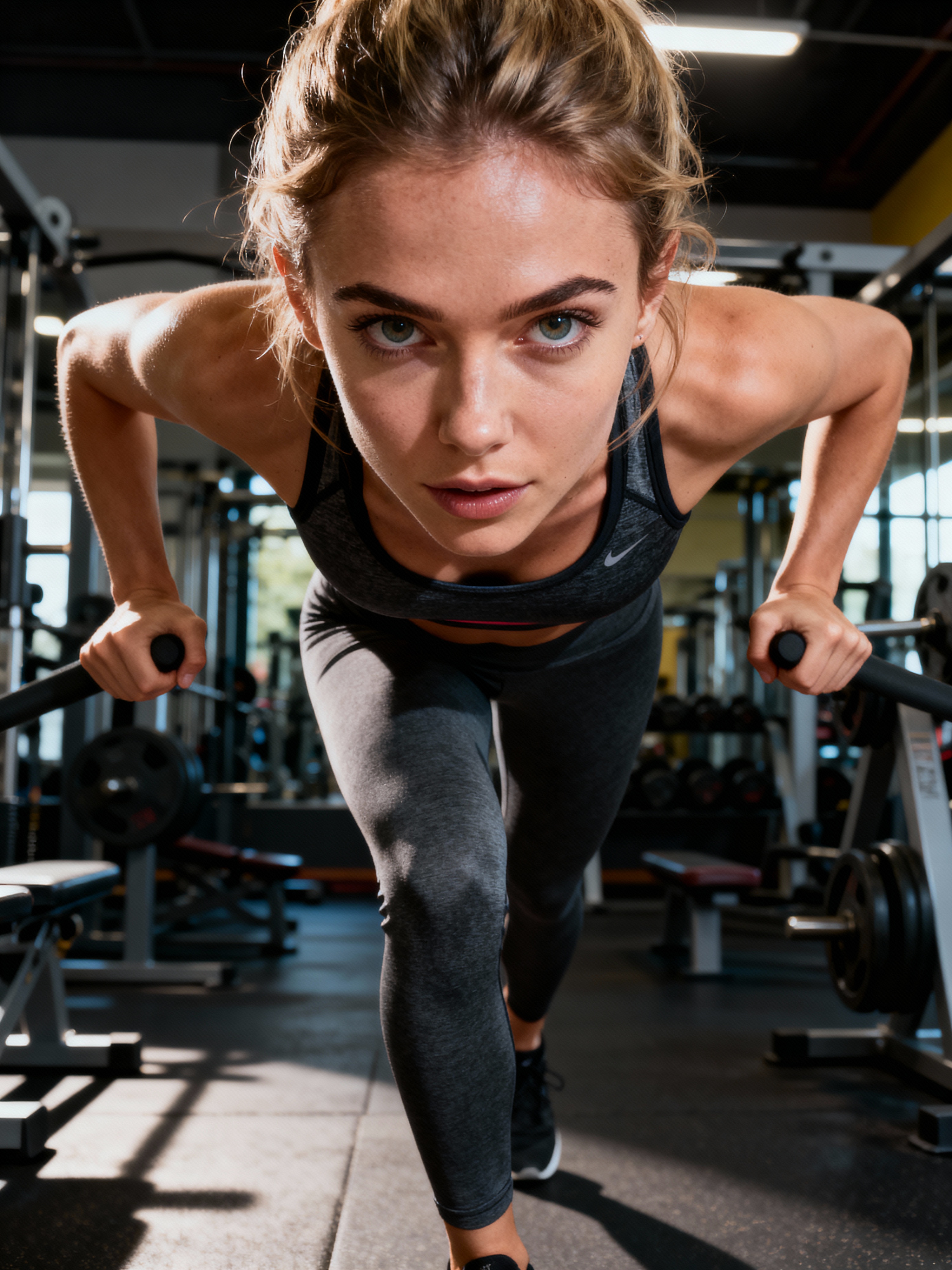 model in dark gray yoga pants and sports top in the fitness gym working out
