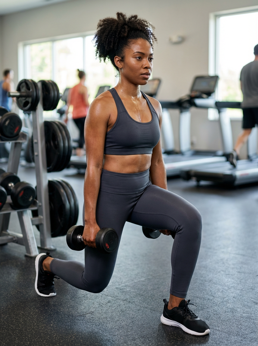 model in dark gray yoga pants and sports top in the fitness gym working out