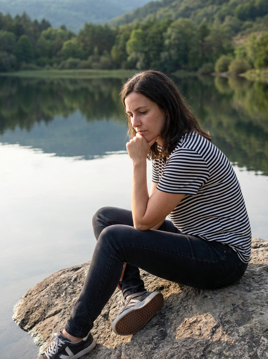 model in deep contemplation, sitting by a tranquil lake