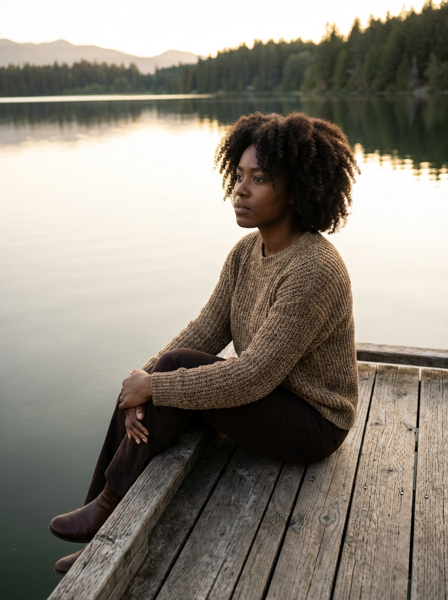 model in deep contemplation, sitting by a tranquil lake