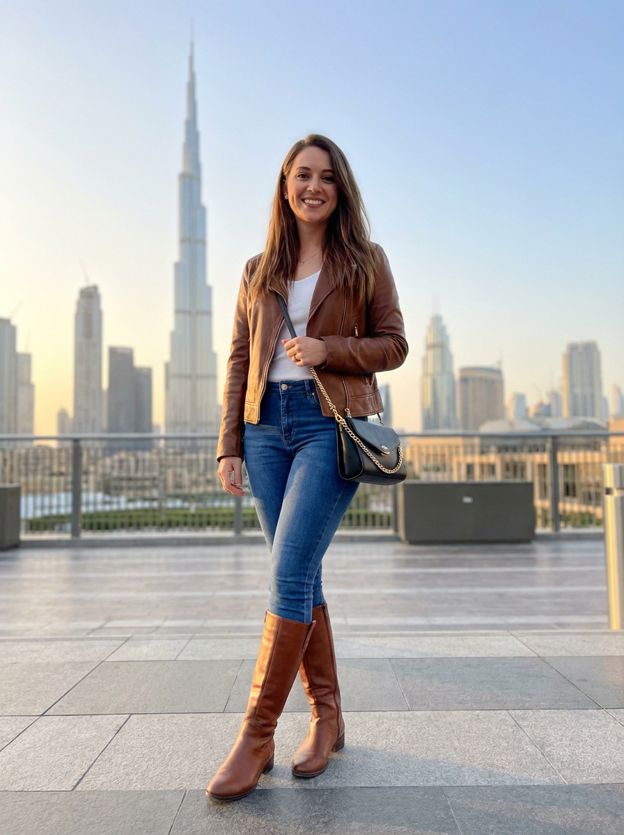 model in Dubai with skyline in background