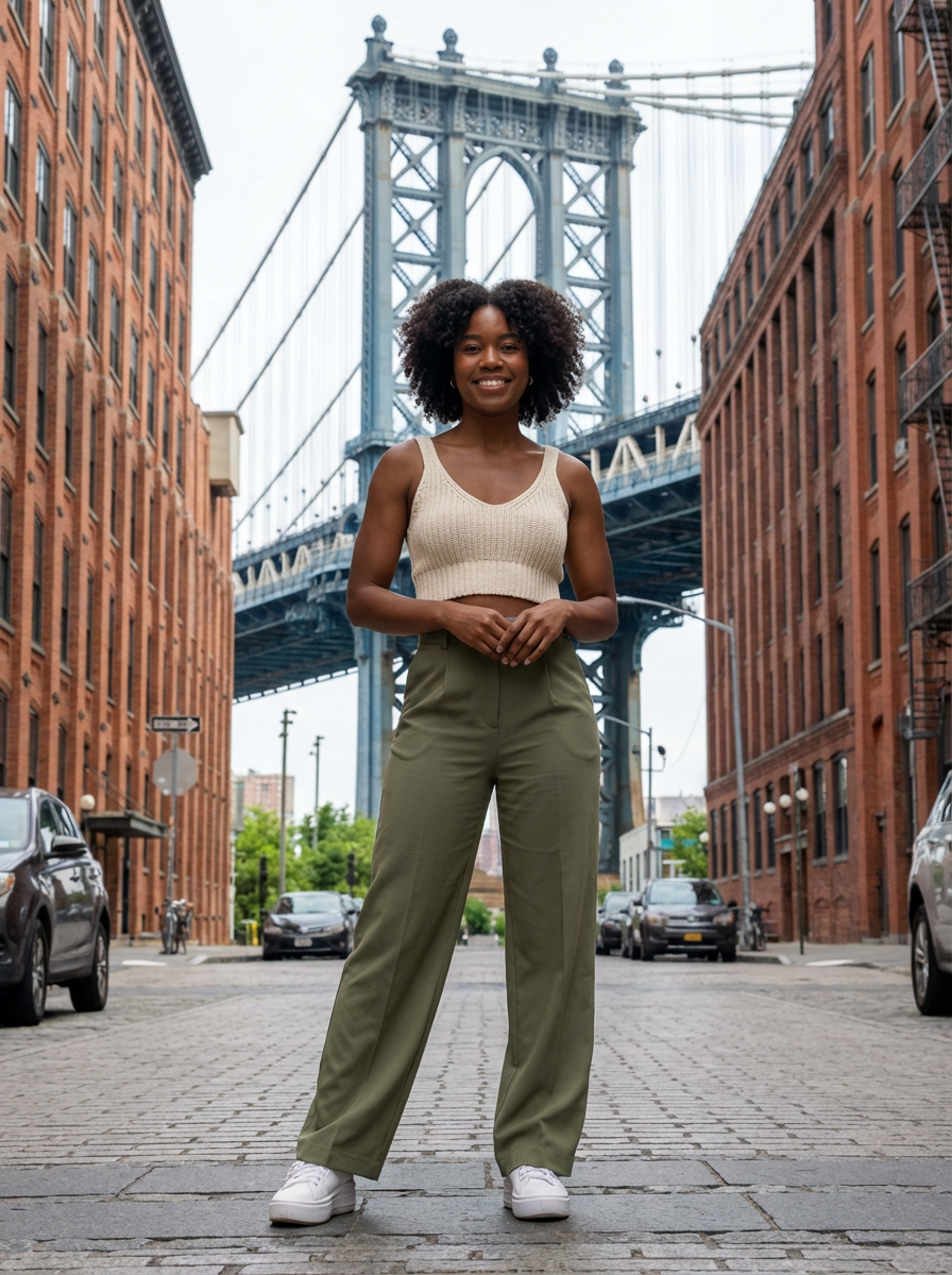 model in DUMBO Brooklyn, Manhattan Bridge view, Instagram-famous spot, stylish outfit