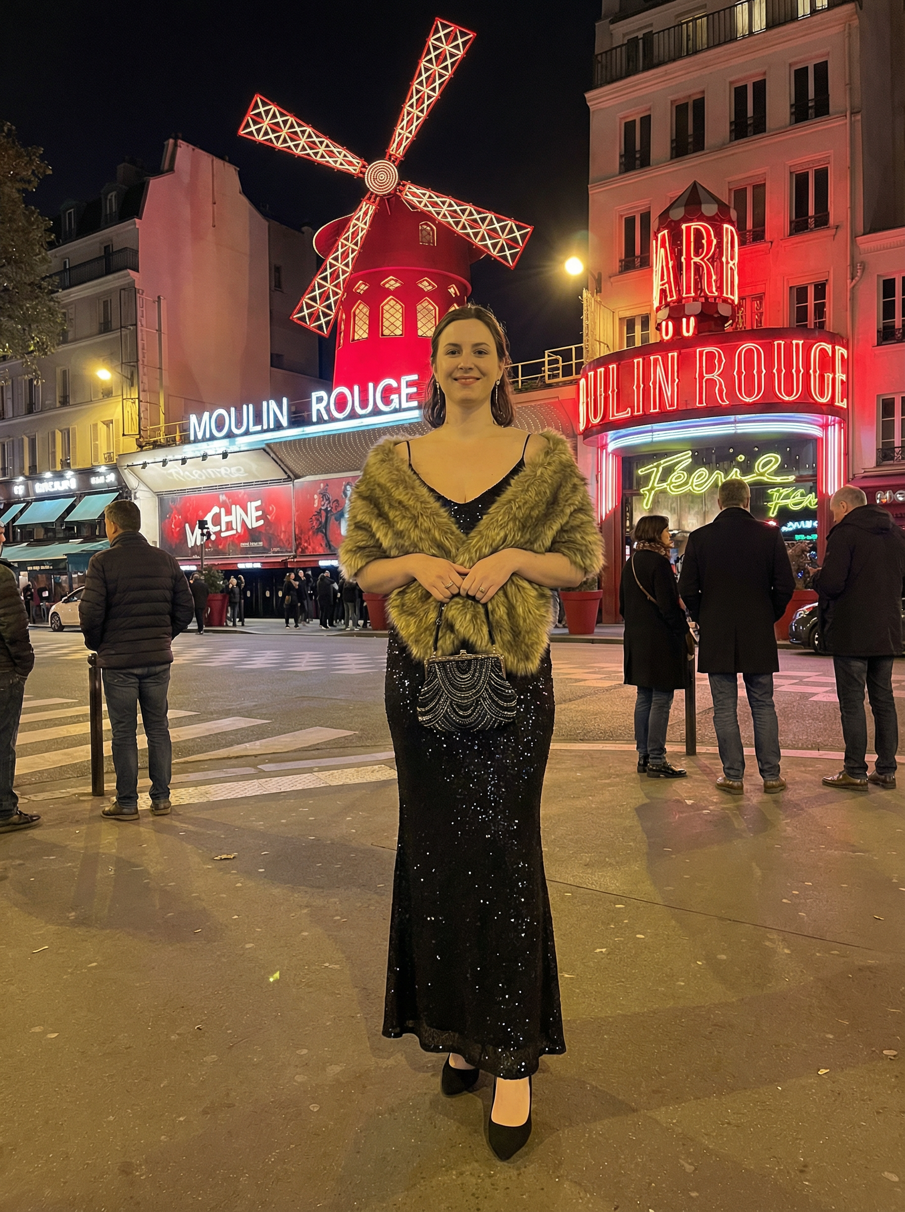 model in elegant evening gown, wrap, heels, evening bag at Moulin Rouge entrance, iconic cabaret venue, red windmill sign, evening entertainment district, glamorous nightlife, theatrical Parisian culture