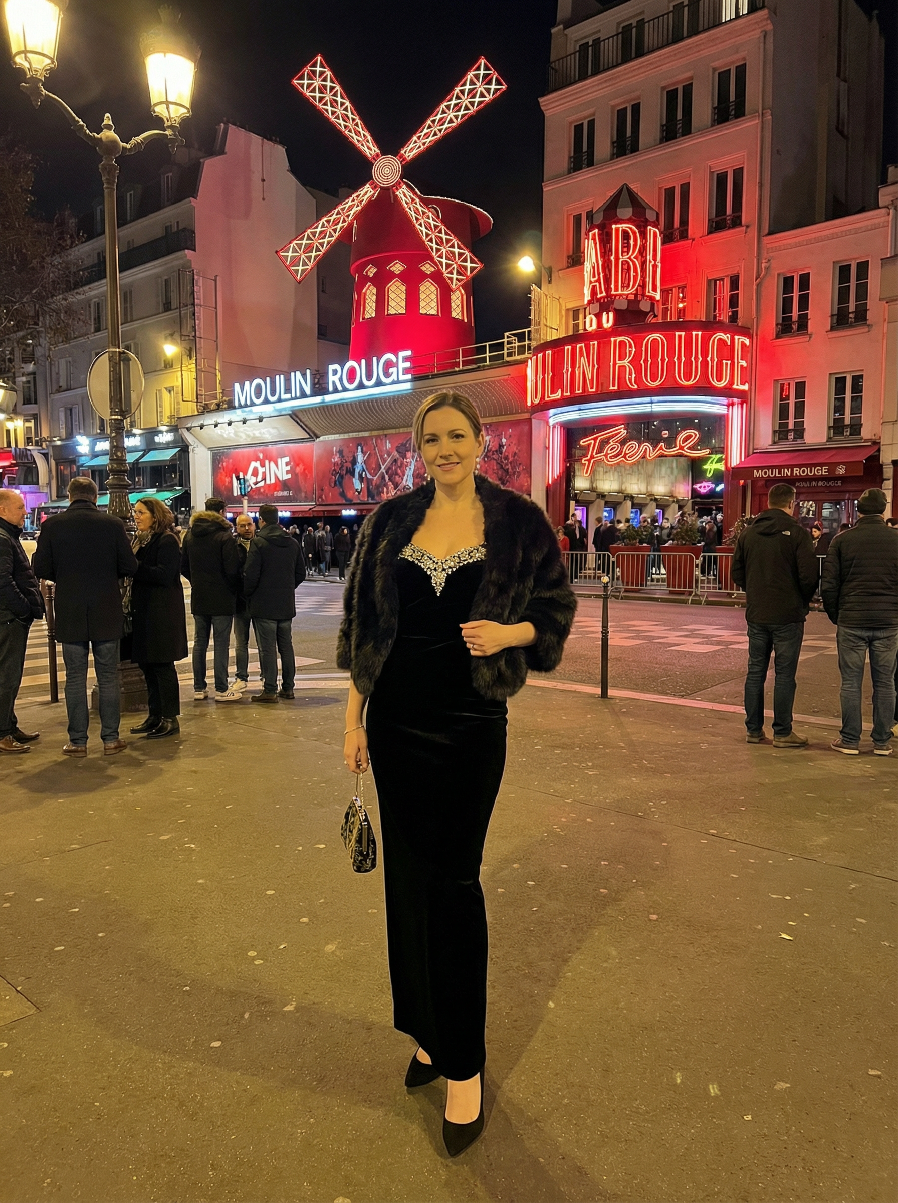 model in elegant evening gown, wrap, heels, evening bag at Moulin Rouge entrance, iconic cabaret venue, red windmill sign, evening entertainment district, glamorous nightlife, theatrical Parisian culture