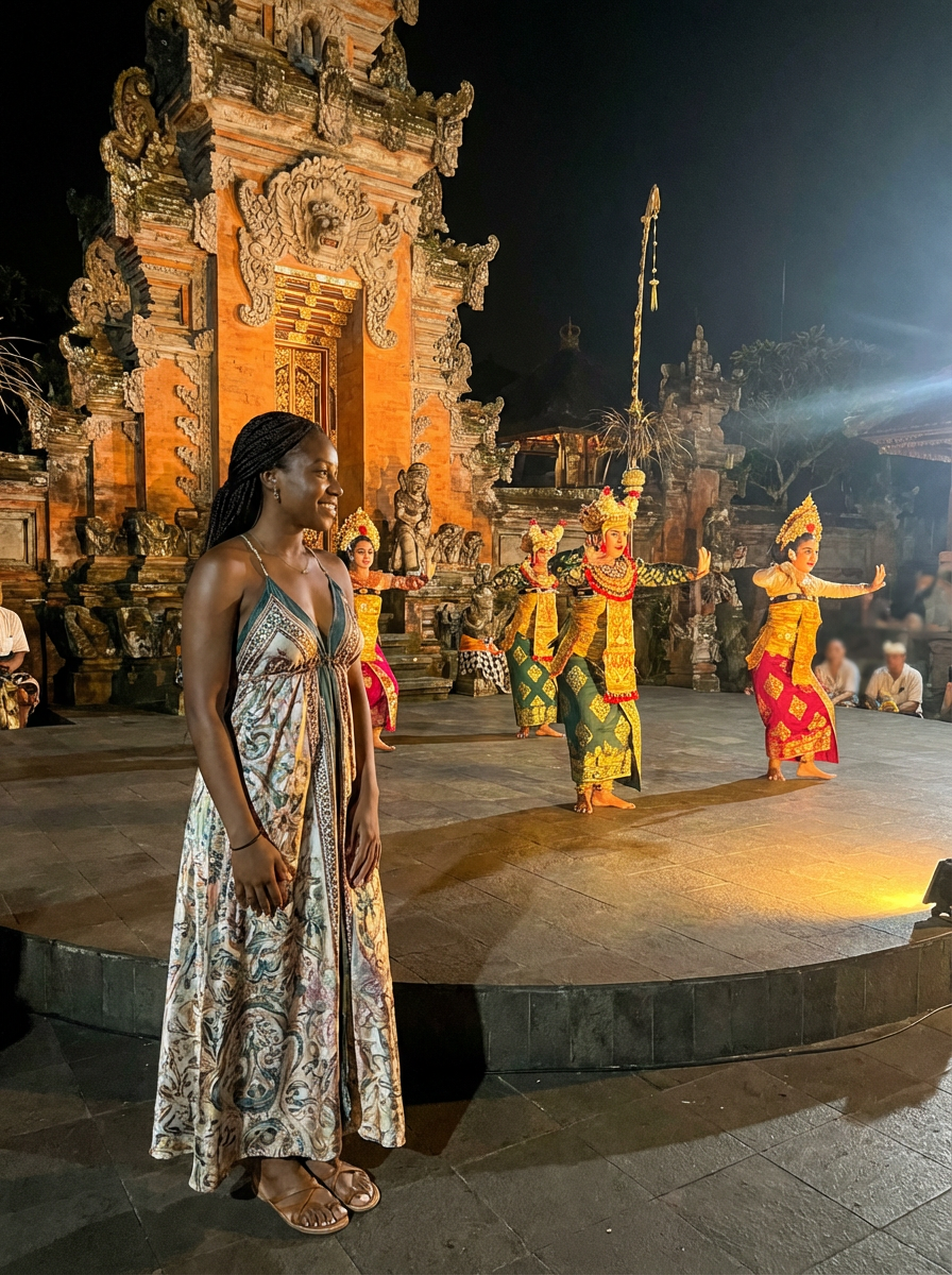 model in elegant resort wear at traditional Balinese dance performance, temple backdrop illuminated at night