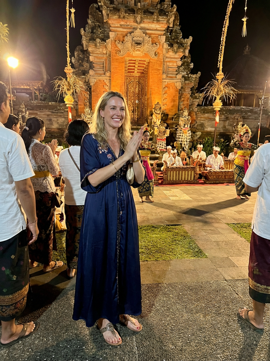 model in elegant resort wear at traditional Balinese dance performance, temple backdrop illuminated at night