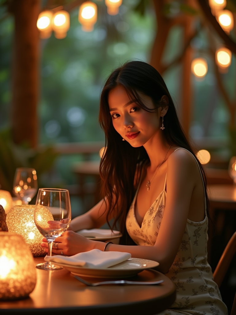 model in elegant resort wear dining at luxury treehouse restaurant in jungle setting, fairy lights and lanterns