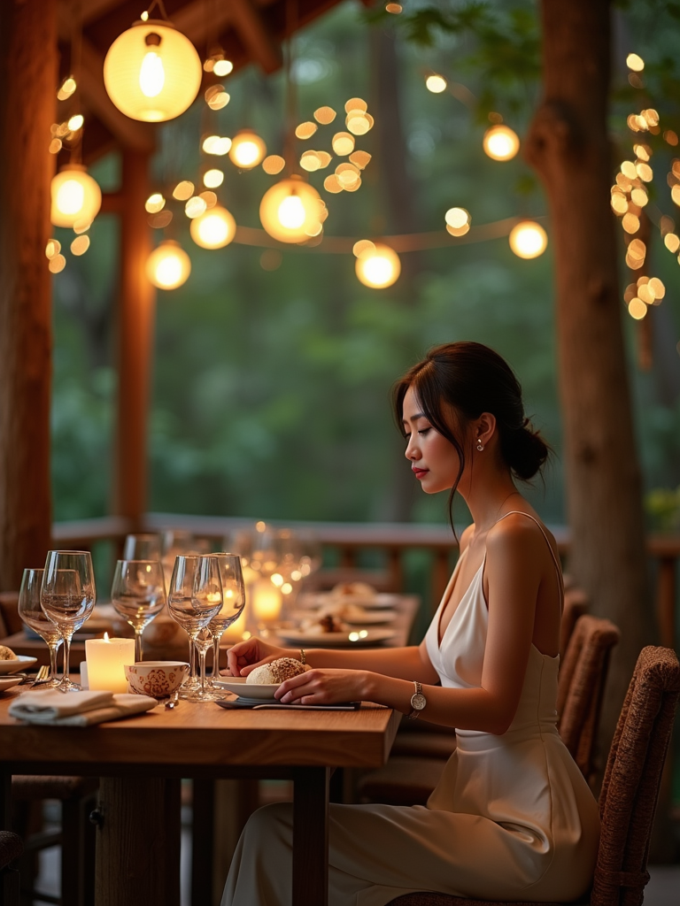 model in elegant resort wear dining at luxury treehouse restaurant in jungle setting, fairy lights and lanterns