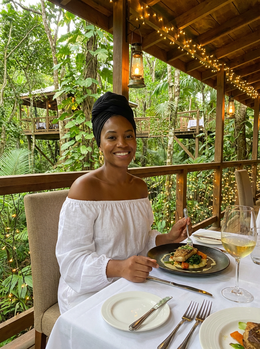 model in elegant resort wear dining at luxury treehouse restaurant in jungle setting, fairy lights and lanterns