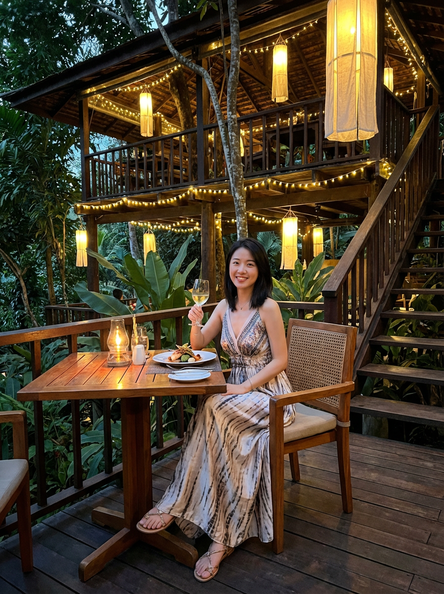 model in elegant resort wear dining at luxury treehouse restaurant in jungle setting, fairy lights and lanterns