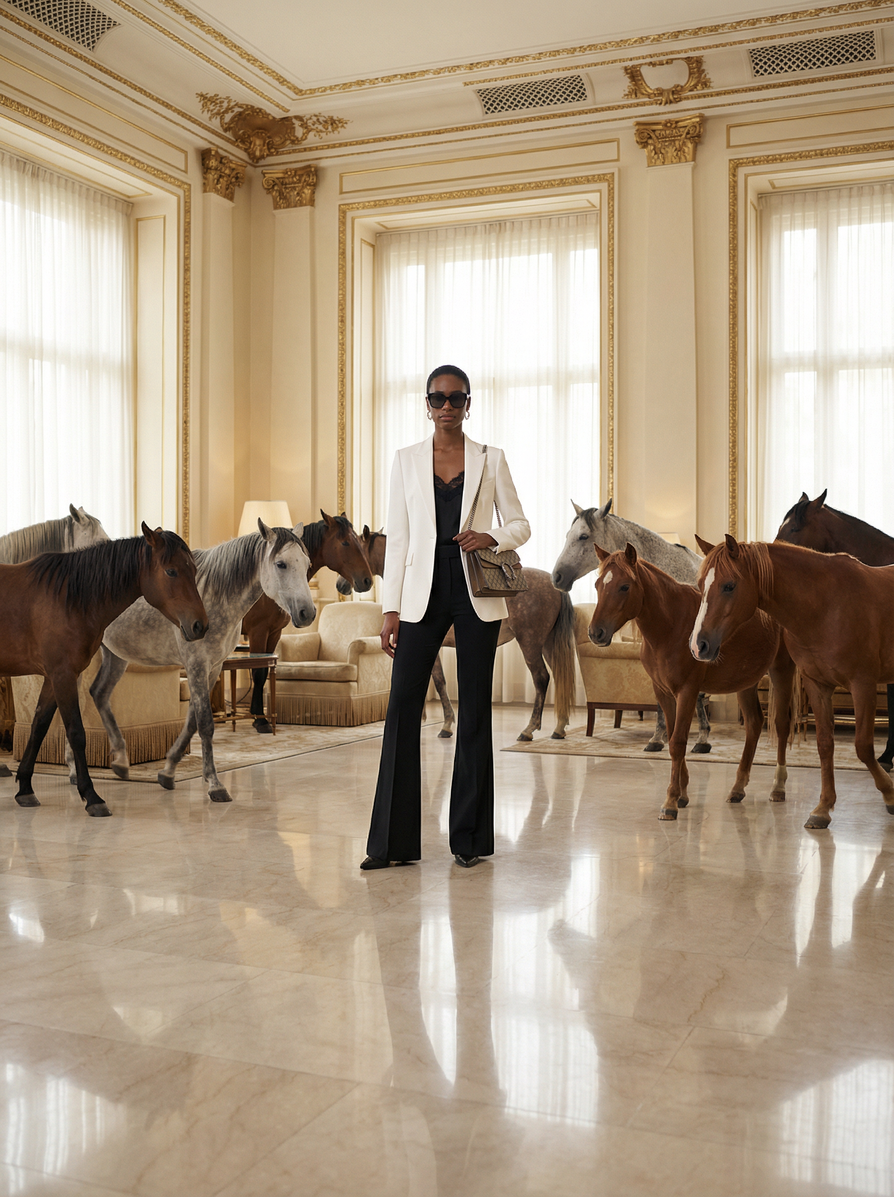 model in equestrian-inspired: sharp white blazer, black flared trousers, lace-trim top, sunglasses, designer shoulder bag inside a grand hotel lobby with cream walls and ornate trim, a surreal high-fashion moment with 15 wild horses standing and moving calmly around the model like an editorial set, polished marble floor reflections, soft indoor daylight, ultra-realistic