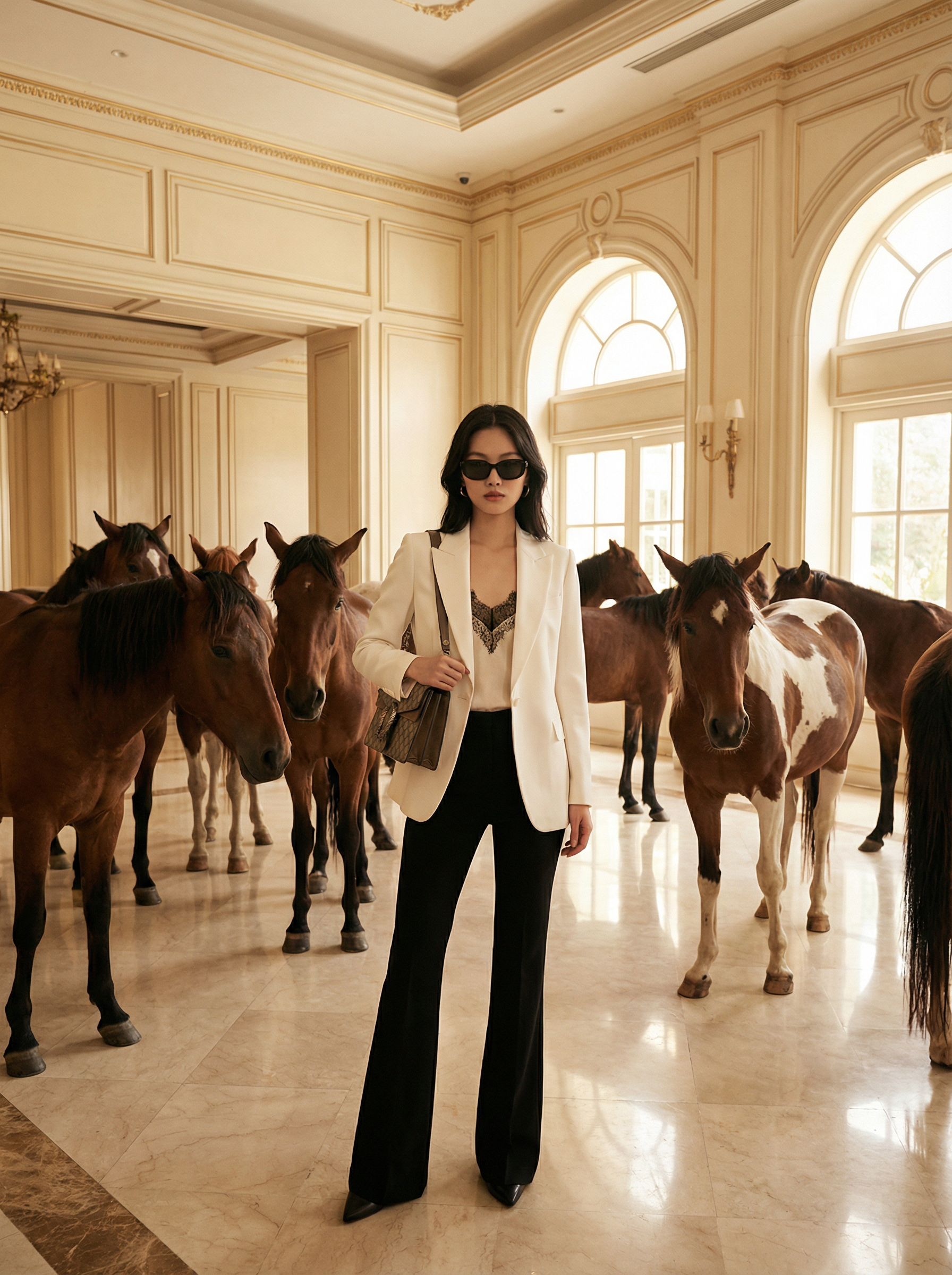 model in equestrian-inspired: sharp white blazer, black flared trousers, lace-trim top, sunglasses, designer shoulder bag inside a grand hotel lobby with cream walls and ornate trim, a surreal high-fashion moment with 15 wild horses standing and moving calmly around the model like an editorial set, polished marble floor reflections, soft indoor daylight, ultra-realistic