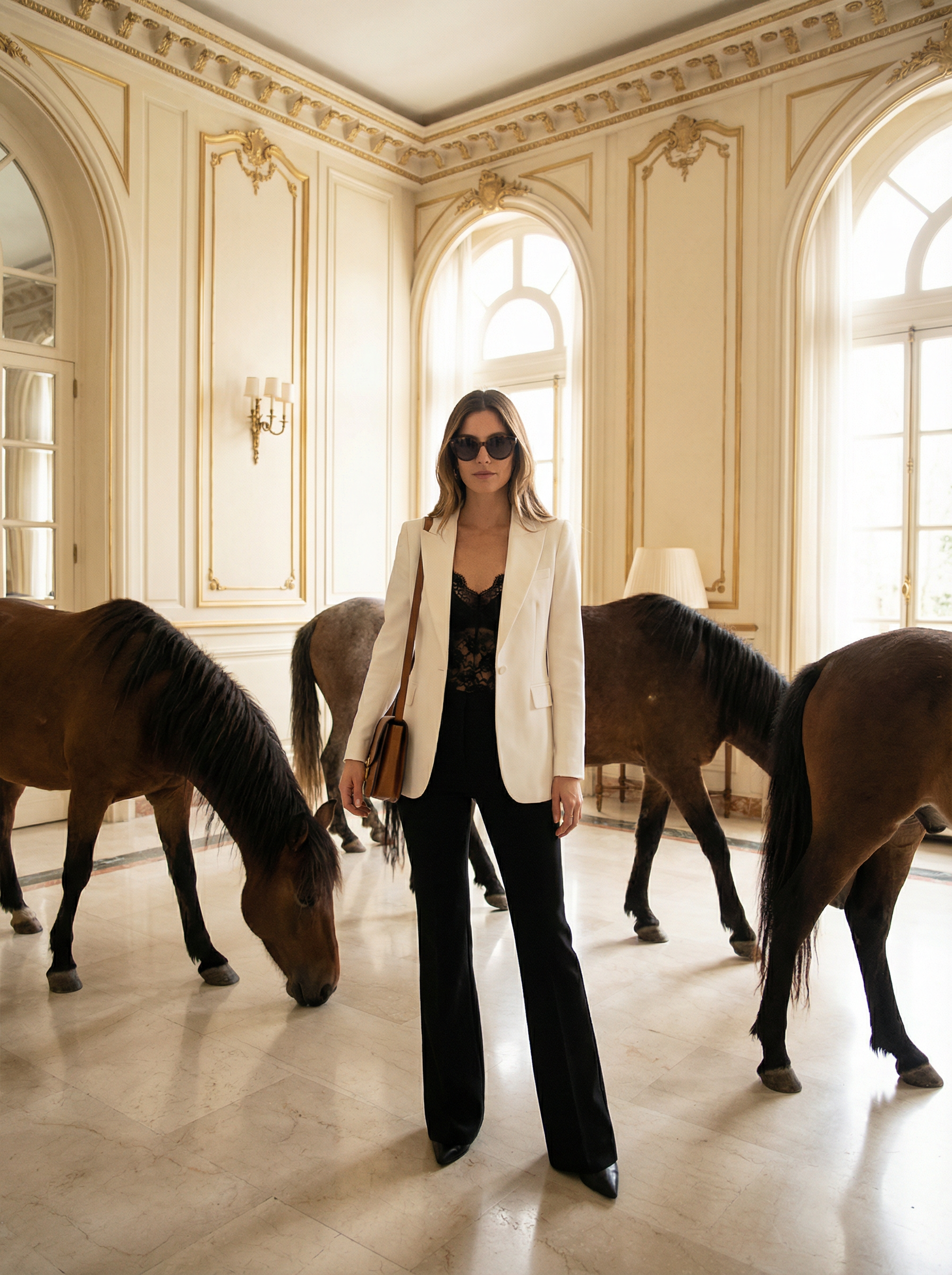 model in equestrian-inspired: sharp white blazer, black flared trousers, lace-trim top, sunglasses, designer shoulder bag inside a grand hotel lobby with cream walls and ornate trim, a surreal high-fashion moment with 15 wild horses standing and moving calmly around the model like an editorial set, polished marble floor reflections, soft indoor daylight, ultra-realistic