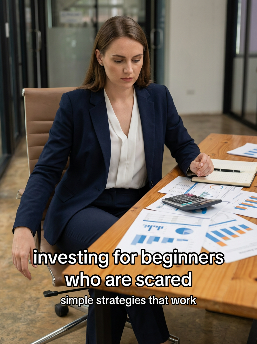 model in financial planning outfit at desk with financial documents and calculator, focused expression, professional lighting. TikTok TikTok-style text overlay with white text with black outline: "investing for beginners who are scared" smaller text: "(simple strategies that work)" , do not show tiktok interface or logo