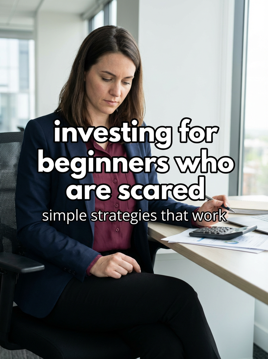 model in financial planning outfit at desk with financial documents and calculator, focused expression, professional lighting. TikTok TikTok-style text overlay with white text with black outline: "investing for beginners who are scared" smaller text: "(simple strategies that work)" , do not show tiktok interface or logo